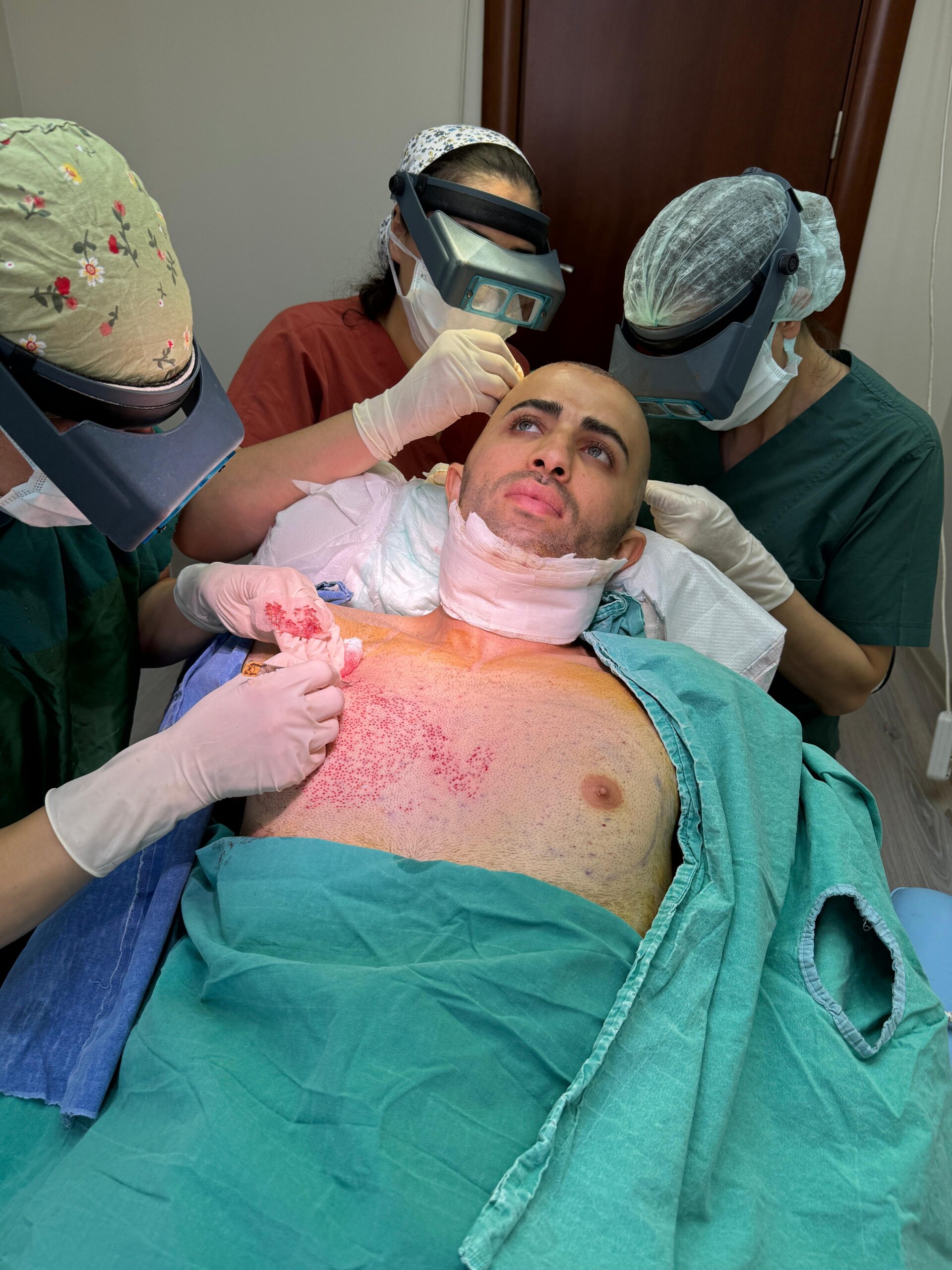 Our clinic has years of experience in body hair transplants, consistently achieving successful results with a high number of grafts. Body hair is usually preferred to enhance density in the middle and back areas of the scalp. If there are sufficient grafts in the scalp donor area, unnecessary use of body hair is avoided. However, if the scalp donor area is insufficient, grafts are utilized sequentially from the beard, chest, back, shoulders, and abdomen.